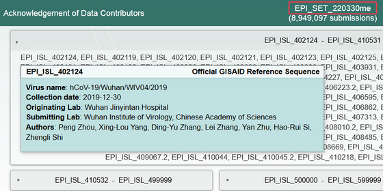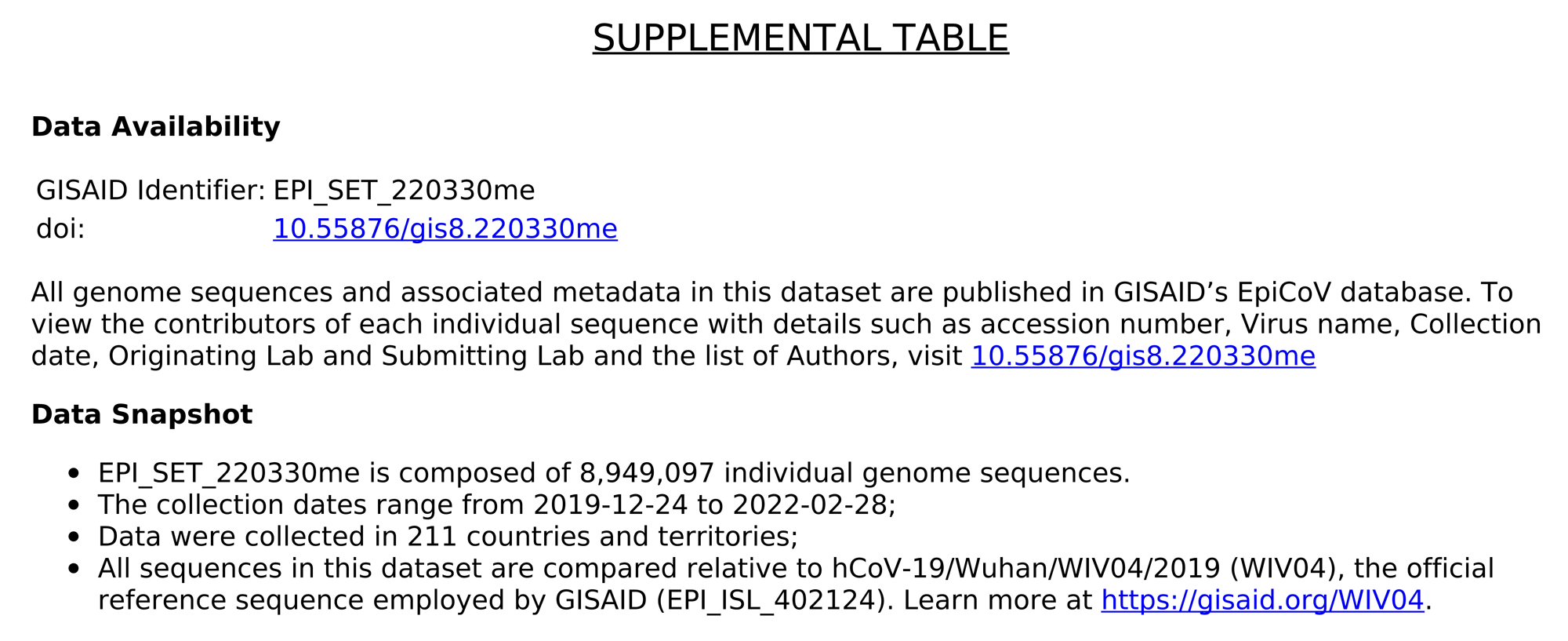 Each EPI_SET ID and the corresponding DOI can be used in any publication to fulfill the essential requirement of acknowledging contributors of data on which any research or analyses are based. By either by clicking on the DOI, or by pasting the EPI_SET ID in the "Data Acknowledgement Locator" on the GISAID homepage (under Resources), anyone – including those without GISAID Access Credentials, may instantly access the details of the data contributors.