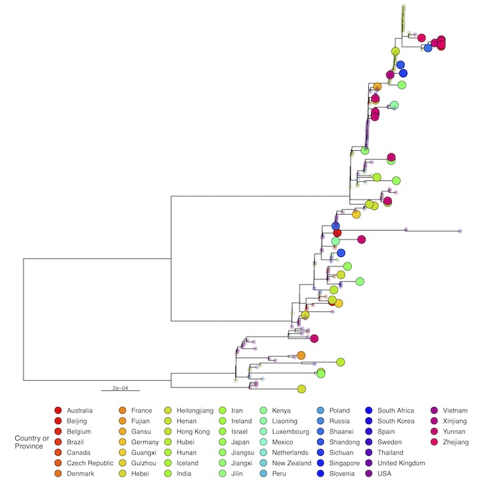 Phylogenetic analyses suggest at least 35 independent introductions from outside China rather than extensive local transmission. This indicates that measures are mostly effective in disrupting long transmission chains following import.
