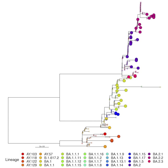 Eleven genomes were assigned as Delta (from six distinct lineages), and 66 genomes were assigned as Omicron (from 14 distinct lineages). No highly divergent new variants were found.