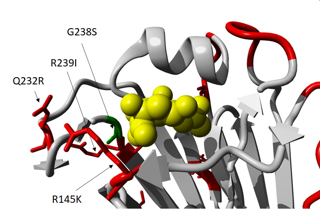 HA receptor binding pocket of a human infecting H10N8 (PDB:4QY2 dx.doi.org/10.1038/ncomms6600) with the differences of the new H10N3 highlighted in red and green. The human host receptor is shown in yellow. A unique G238S (alternative numbering: H3=228 H1=225) mutation that is known in other subtypes to favor 2,6 (human) over 2,3 (avian) receptors (e.g. H3 G228S in dx.doi.org/10.1128/jvi.74.18.8502-8512.2000) and S at this position is also present in human seasonal H3N2.