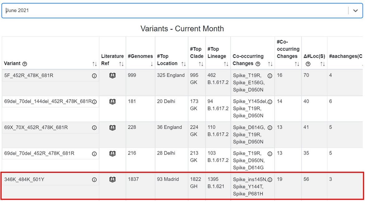 The GISAID Emerging Variants tracker was deployed in February 2021, and enables automated monitoring and ranking of new combinations of relevant spike protein changes in EpiCoV™ that may become variants of interest (VOI) or variants of concern (VOC) in the future. B.1.621 appeared ranked in the top 5 variants in the Emerging Variants tracker (Fig. 3) as early as June 2021.