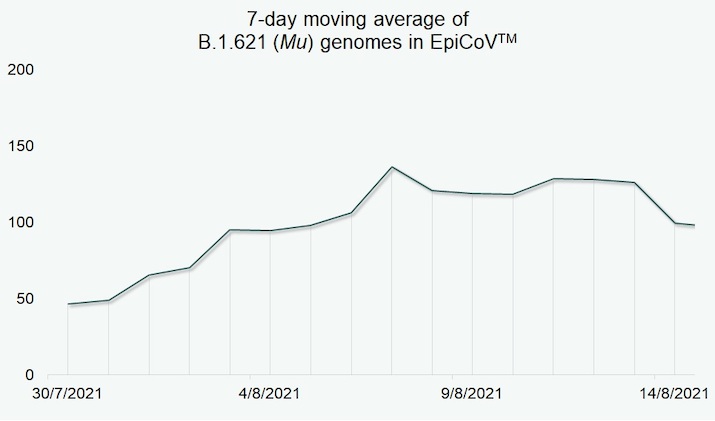 Figure 1. B.1.621 (Mu) submissions in EpiCoV™ between 30 July and 14 August 2021