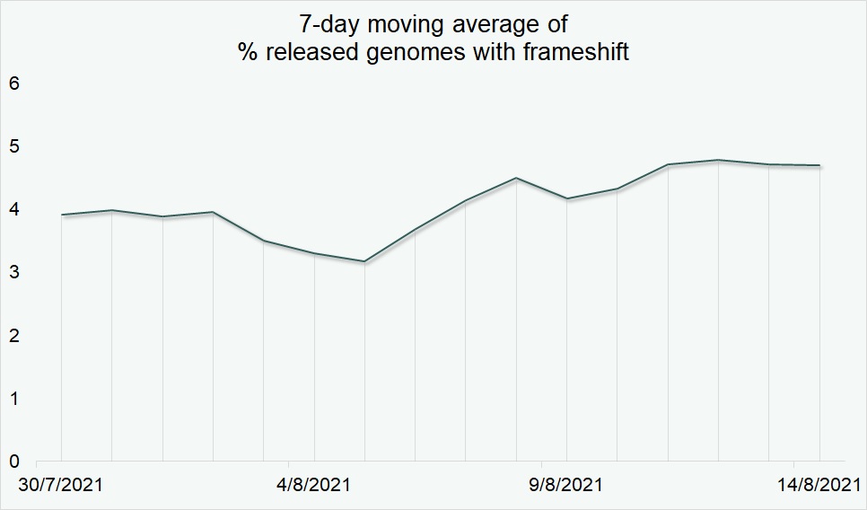 With at least 18-months of evolution, some of these viral sequence changes begin to occur naturally. Several of these changes have already been confirmed by submitters. By mid-August 2021, over 100,000 frameshifts have been confirmed and are noted in the data records, the earliest of which was detected and confirmed in April 2020 (EPI_ISL_419444). Many advanced sequencing laboratories, in particular those generating high volumes of data (e.g. COG-UK), have already tuned their bioinformatics pipelines to detect insertions and deletions more reliably, while others are building capacity in this area. Since late 2020, these changes passing their pipelines are directly accepted in GISAID’s EpiCoV™ curation workflow.